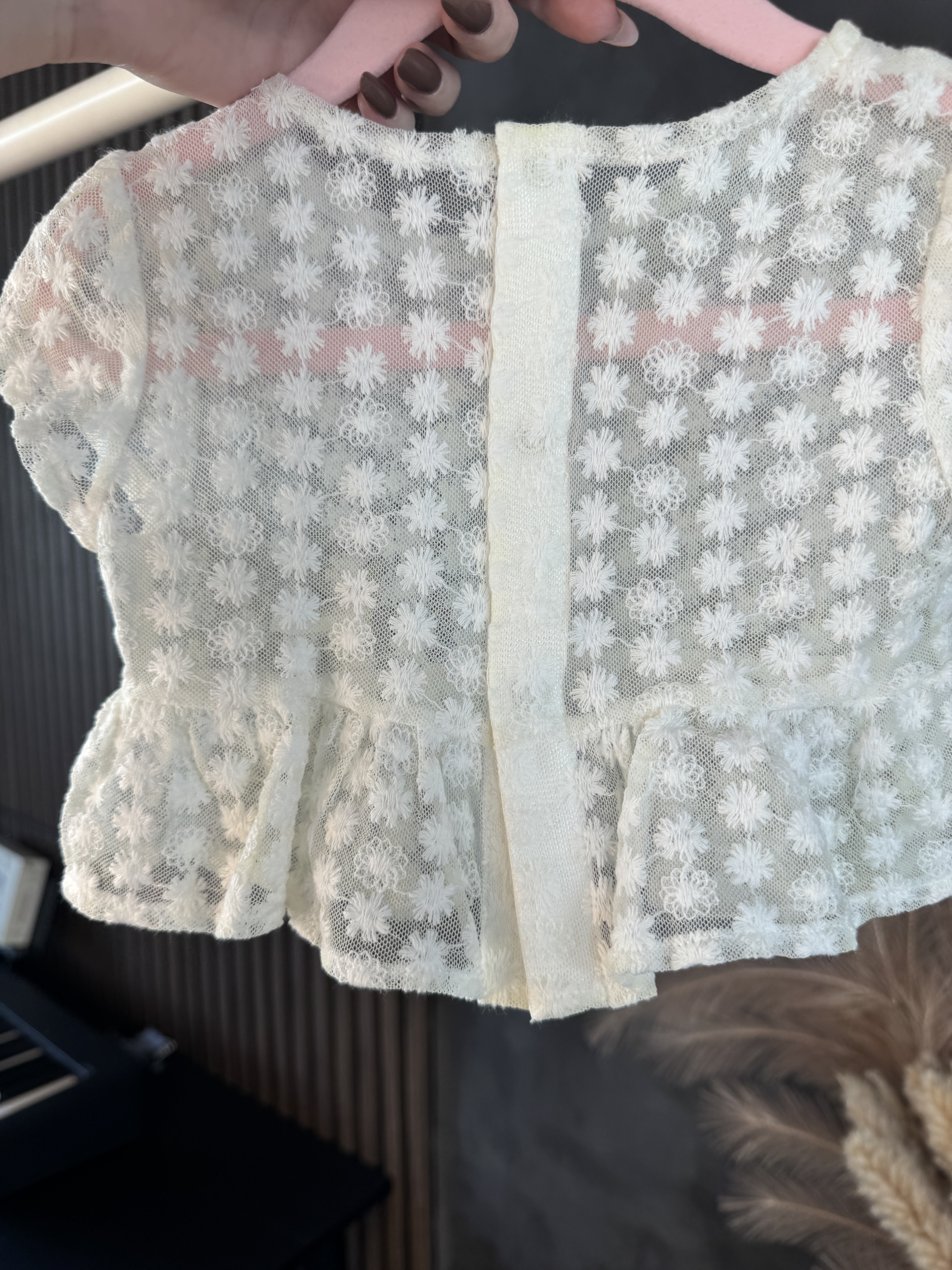 Bolerko/ narzutka z krótkim rękawem w kwiatową koronką i falbanką na dole