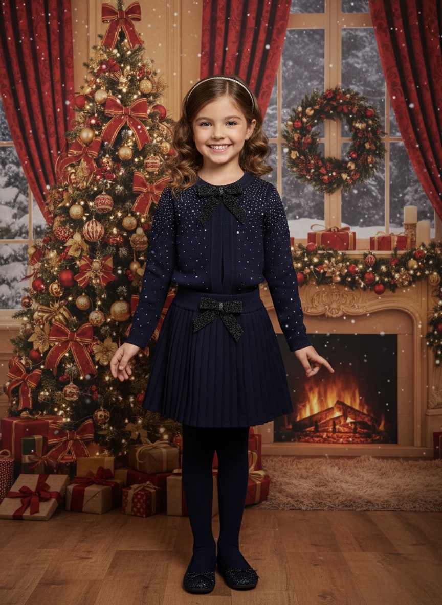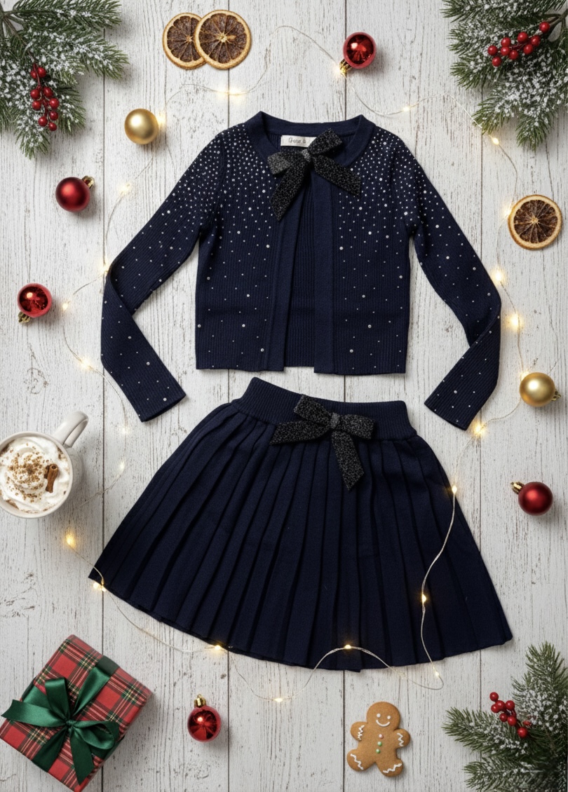 Elegancki komplet dla dziewczynki marki Yoyo S. to wyjątkowa propozycja z kolekcji francuskiej marki premium, która łączy subtelną elegancję z dziewczęcym wdziękiem. W skład zestawu wchodzi cienki sweter ozdobiony kokardką u góry z delikatnymi kryształkami oraz sweterkowa spódniczka z efektowną brokatową kokardą. Granatowy kolor nadaje całości klasy i ponadczasowego charakteru.
