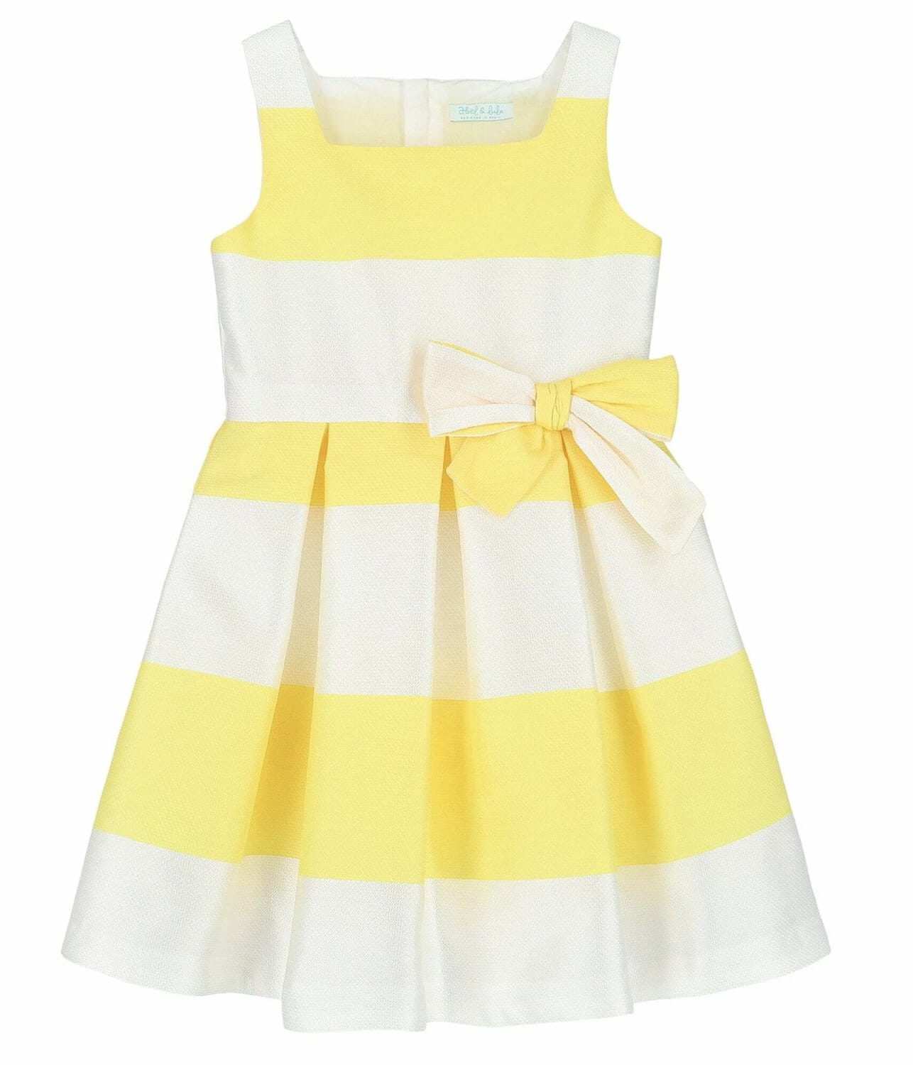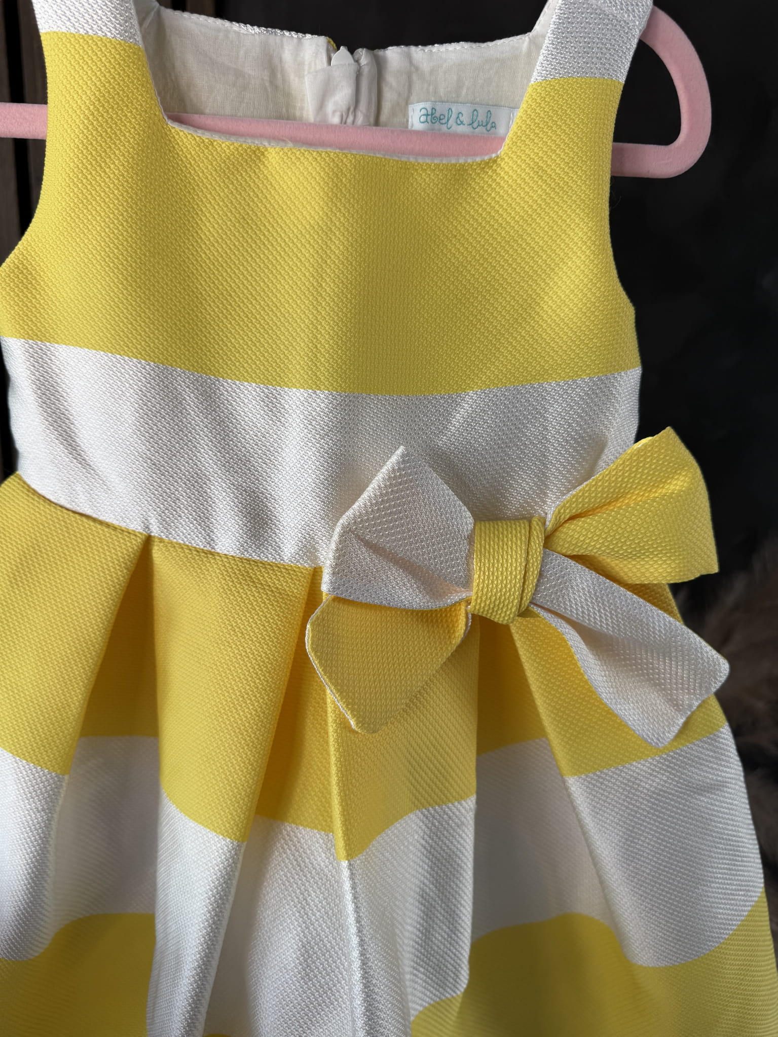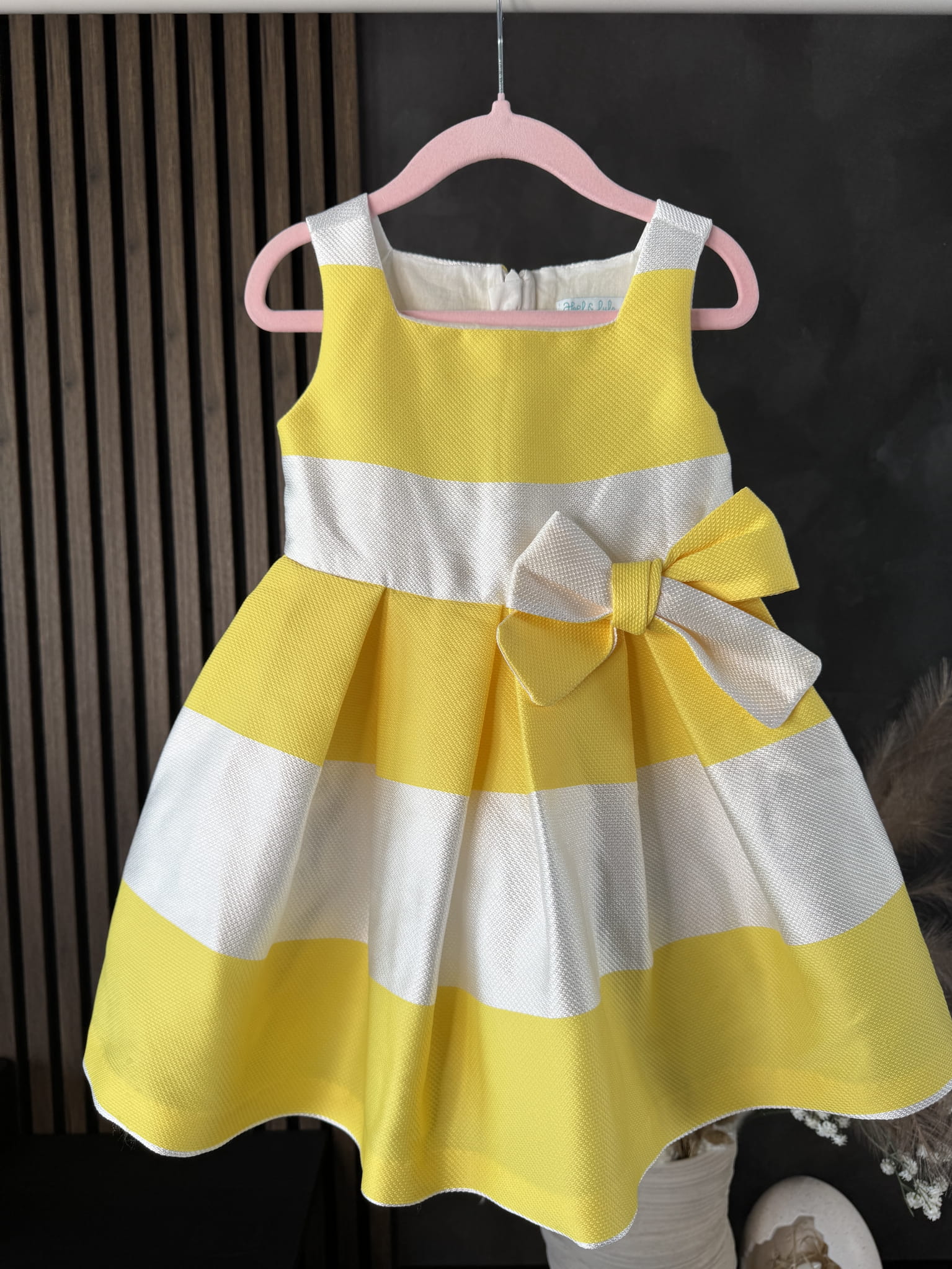 Sukienka zachwyca klasycznym wzorem w biało-żółte paski, które nadają jej lekkości i wakacyjnego charakteru. Z boku umieszczono ozdobną kokardę, która dodaje całości wyjątkowego uroku i sprawia, że stylizacja staje się jeszcze bardziej dziewczęca i dopracowana.