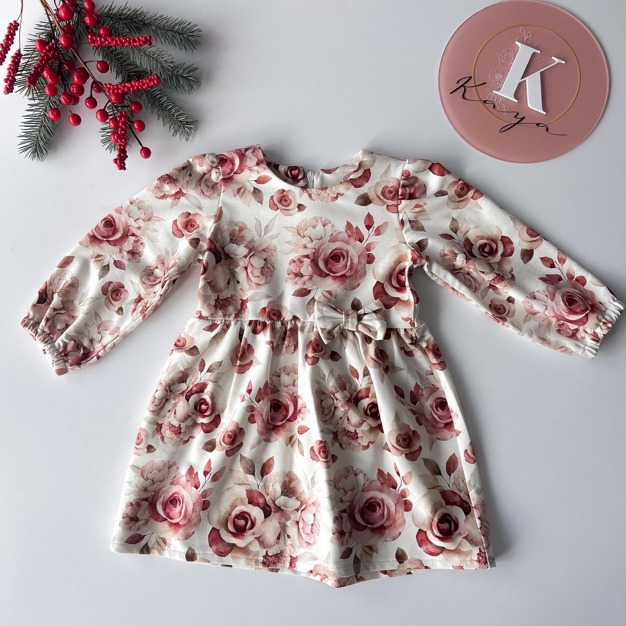 Sukienka z długim rękawem w kwiaty róże z kokardą z przodu Kaya Handmade
