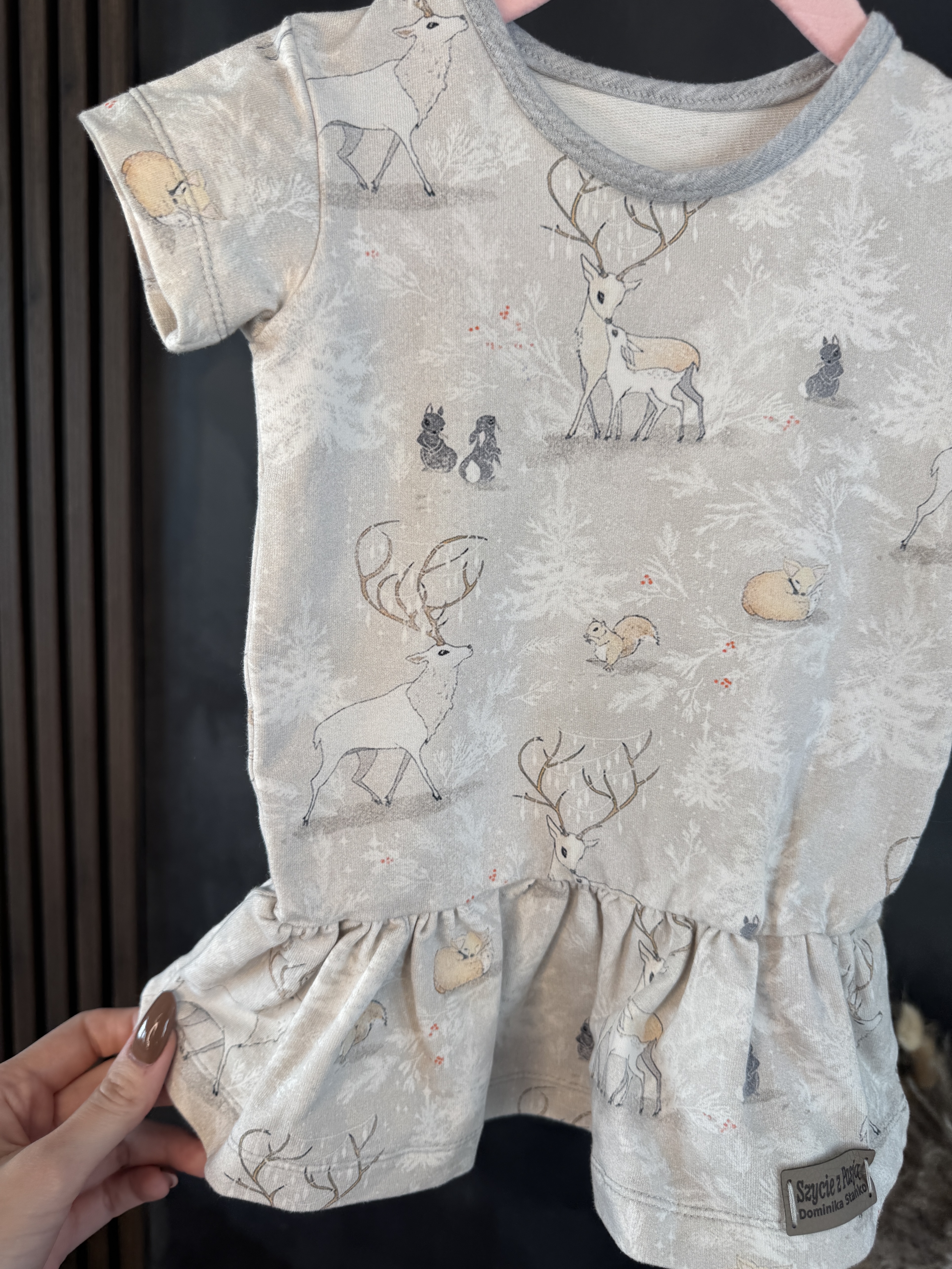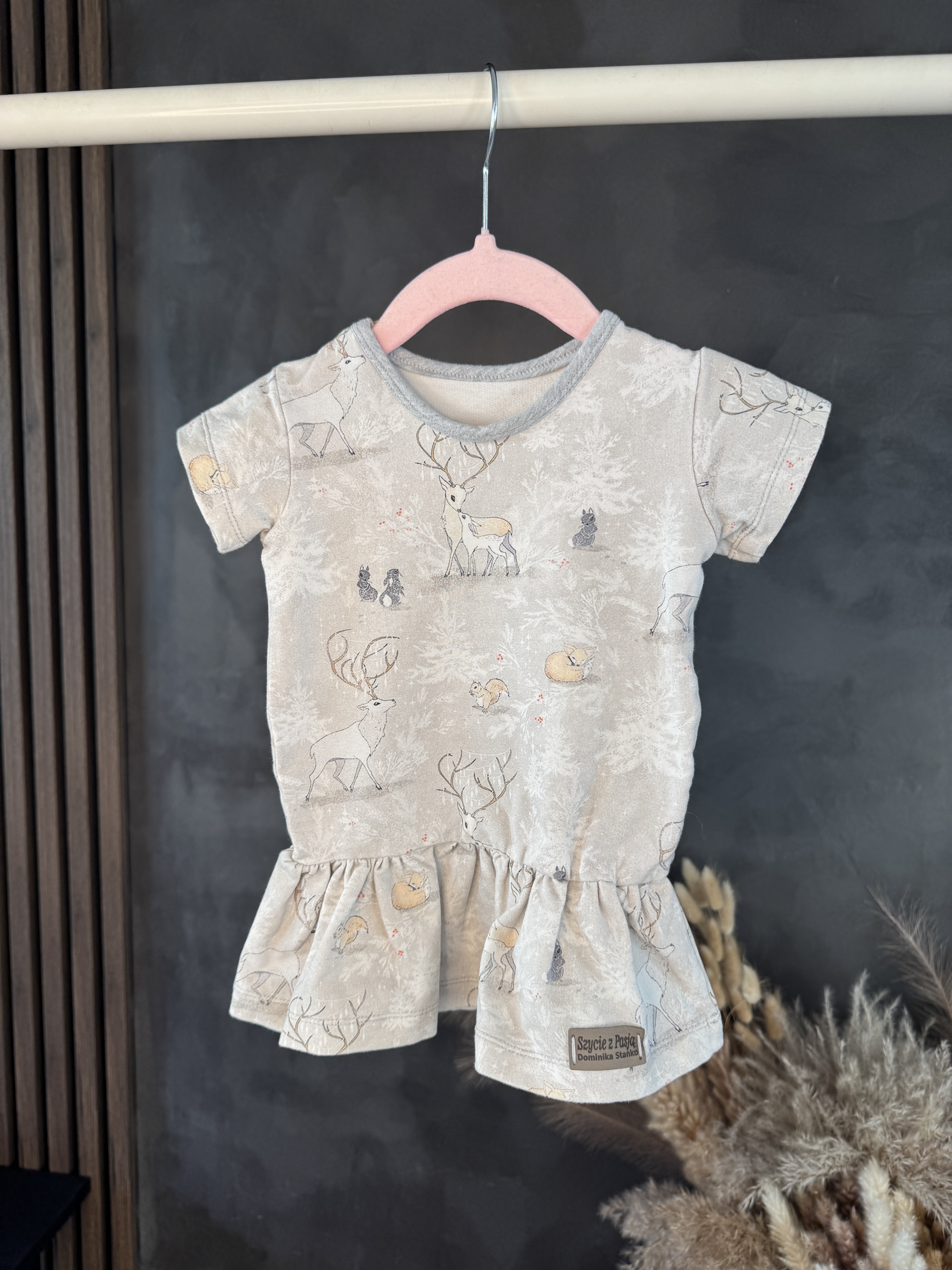 Urocza tunika z krótkim rękawem w zimowy print to wyjątkowa propozycja handmade dla najmłodszych. Rozmiar 80/86 sprawdzi się idealnie dla maluchów, a klasyczny szary kolor stanowi doskonałe tło dla zimowego wzoru. To stylowy i jednocześnie wygodny element dziecięcej garderoby, który łączy estetykę z codziennym komfortem noszenia.