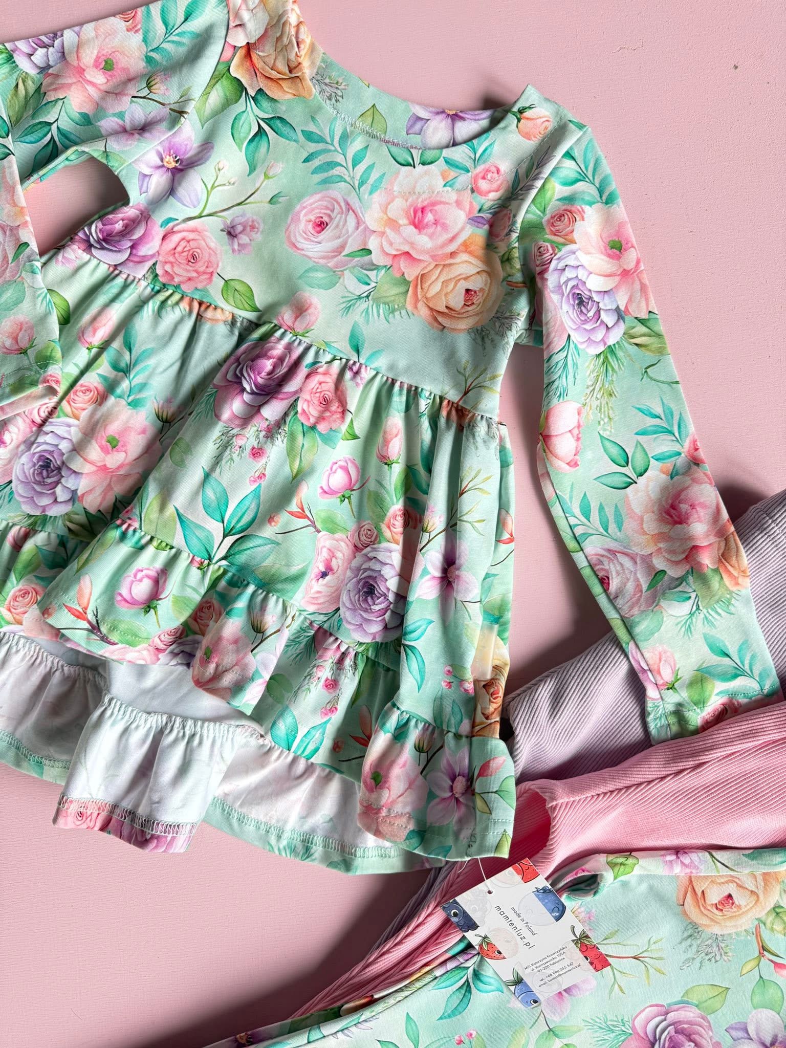 Tunika dla dziewczynki w róże Mam Ten Luz Handmade miętowa z falbankami
