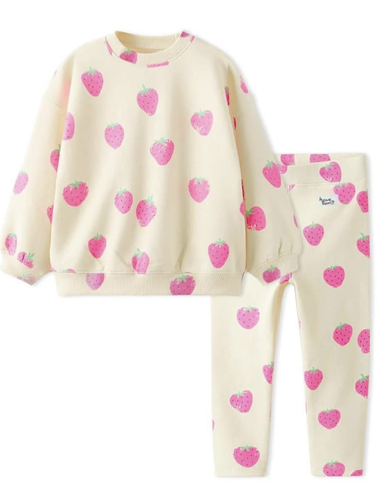 Cały komplet ozdobiony jest motywem truskawek, który dodaje mu wyjątkowego, radosnego charakteru. To doskonała propozycja dla małych miłośniczek owocowych wzorów i pastelowych kolorów. Subtelne połączenie różu i kremu sprawia, że zestaw jest stylowy, a jednocześnie ponadczasowy.